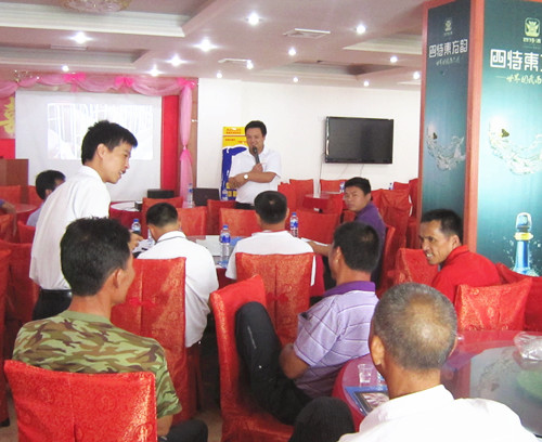 會(huì)議一開始,技術(shù)總監(jiān)郭金權(quán)現(xiàn)場回答養(yǎng)殖戶的問題,進(jìn)行一對一的交流,為養(yǎng)殖戶排憂解惑。