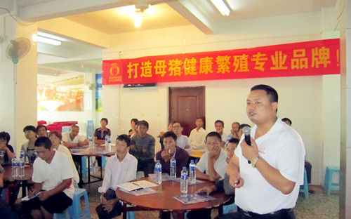 2012年9月15日,福建奧姆龍動物藥業(yè)有限公司營銷總監(jiān)楊思齊和技術總監(jiān)郭金權在龍巖適中悅華酒家二樓開展《夏秋季節(jié)變化豬場常發(fā)疾病的有效防控對策》,為養(yǎng)殖戶提供專業(yè)的技術服務指導。