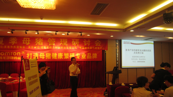 2013年6月14日,公司在廣東英德召開“夏季母豬管理研討會(huì)”暨公司技術(shù)推廣會(huì),會(huì)議在董事長(zhǎng)林振雁的主持下拉開了序幕。緊接著公司技術(shù)部總監(jiān)郭金權(quán)老師針對(duì)“夏季產(chǎn)房母豬常見問題的原因及處理方案”進(jìn)行了詳細(xì)的解說,會(huì)議現(xiàn)場(chǎng)座無虛席,互動(dòng)氛圍熱烈。