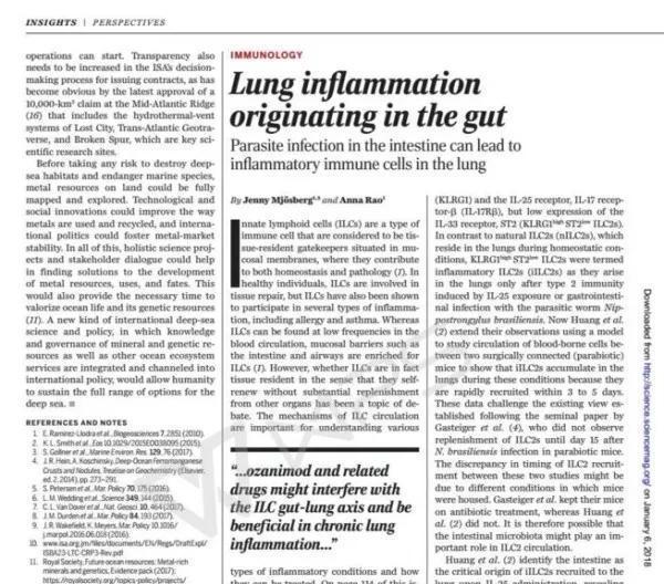 2018年,《科學》雜志發(fā)表的一項重要研究,參與機體的穩(wěn)態(tài)和哮喘和慢性阻塞性肺病等病理過程的天然淋巴細胞會從腸道遷移到肺部參與肺部免疫反應。印證了肺與大腸密切的關(guān)聯(lián)性。