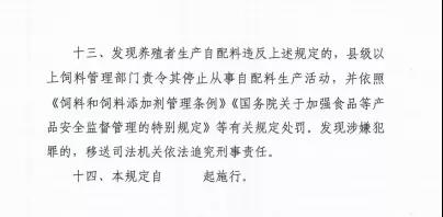 十三、發(fā)現(xiàn)養(yǎng)殖者生產(chǎn)自配料違反上述規(guī)定的,縣級以上飼料管理部門責令其停止從事自配料生產(chǎn)活動,并依照《飼料和飼料添加劑管理條例》《國務院關于加強食品等產(chǎn)品安全監(jiān)督管理的特別規(guī)定》等有關規(guī)定處罰。發(fā)現(xiàn)涉嫌犯罪的,移送司法機關依法追究刑事責任。