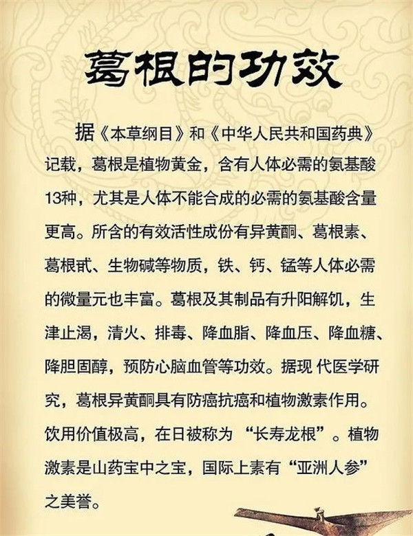 葛根內(nèi)含12%的黃酮類(lèi)化合物,如葛根素、大豆黃酮苷、花生素等營(yíng)養(yǎng)成分,還有蛋白質(zhì)、氨基酸、糖、和人體必需的鐵、鈣、銅、硒等礦物質(zhì),是老少皆宜的名貴滋補(bǔ)品,有“千年人參”之美譽(yù)。早在漢代張仲景的《傷寒論》中就有“葛根湯”這一著名方劑,至今仍是重要的解表方?!侗静菡x》謂葛根“最能開(kāi)發(fā)脾胃清陽(yáng)之氣”。