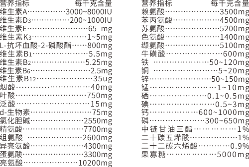 【原料組成 】12種必需氨基酸、中鏈脂肪酸(MCT)、Ω-3(亞麻酸+ EPA+ DHA)、乳酸鈣、膳食纖維、復(fù)合維生素、復(fù)合微量元素、果寡糖、雞肉粉和奶粉(載體)等。